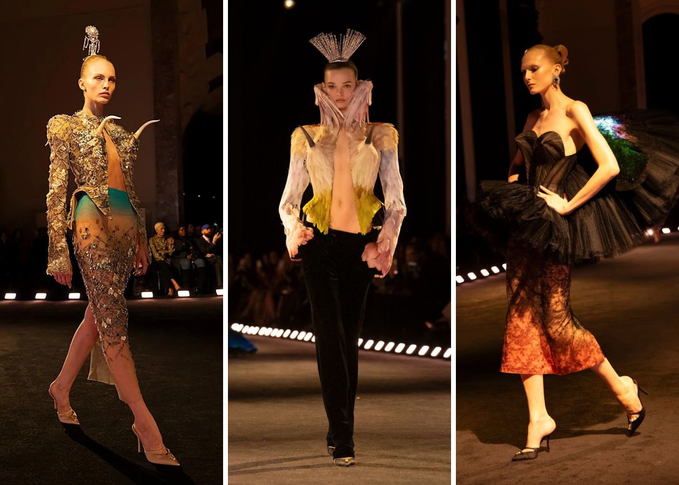 Se trató, ante todo, de una colección de pura fantasía, que mezcló toda una serie de criaturas reptilianas y arácnidas. Sus propuestas incluían una serie de colas de escorpión revestidas de plumas que llevaron varias modelos sobre las cabezas. Por todas partes, las plumas, tanto reales como ramilletes de seda en trampantojo, estaban pintadas a mano, aerografiadas o sumergidas en resina y cristales, en un impresionante despliegue de técnica y arte.