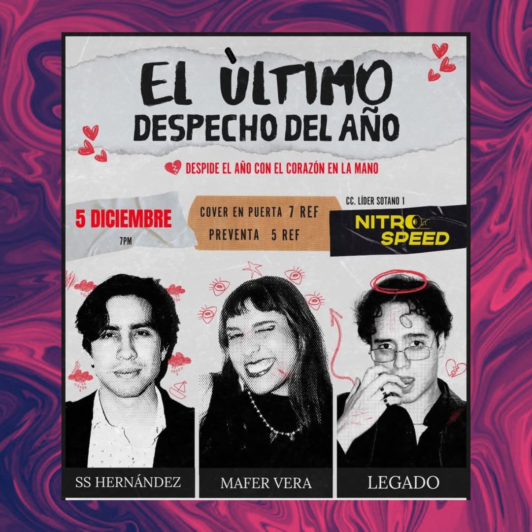 Nitro Speed en el C.C. Lider recibirá a los más despechados para cantar canciones de SS Hernández, Mafer Vera y Legado, quienes presentarán temas para el desamor tanto covers como originales. Entrada en puerta.