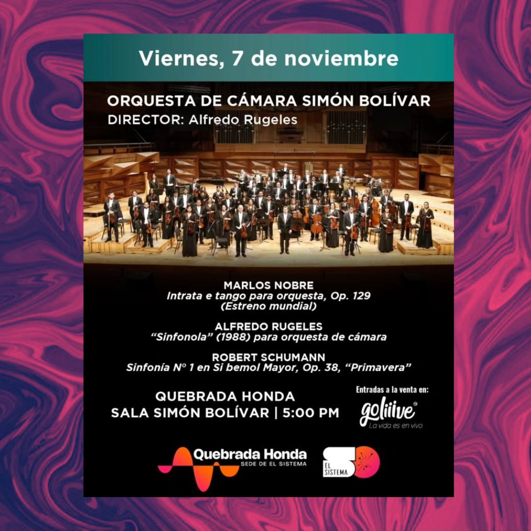 La Orquesta de Cámara Simón Bolívar te invita a un majestuoso concierto bajo la dirección del maestro Alfredo Rugeles, con un programa que reunirá diversas obras. El evento será llevado a cabo en Quebrada Honda (Centro Acción Social). Entradas en GoLiiive.