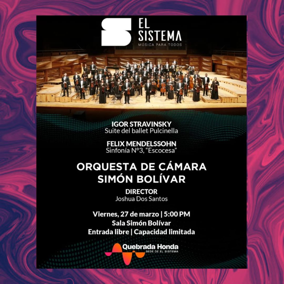 Disfruta en la sala Simón Bolívar, CNASPM (Quebrada Honda).de una tarde sublime junto a la Orquesta de Cámara Simón Bolívar, bajo la dirección del maestro Joshua Dos Santos. Déjate envolver por la genialidad de Igor Stravinsky con su «Suite del Ballet Pulcinella» y la fuerza de la «Sinfonía N°3, Escocesa» de Felix Mendelssohn.