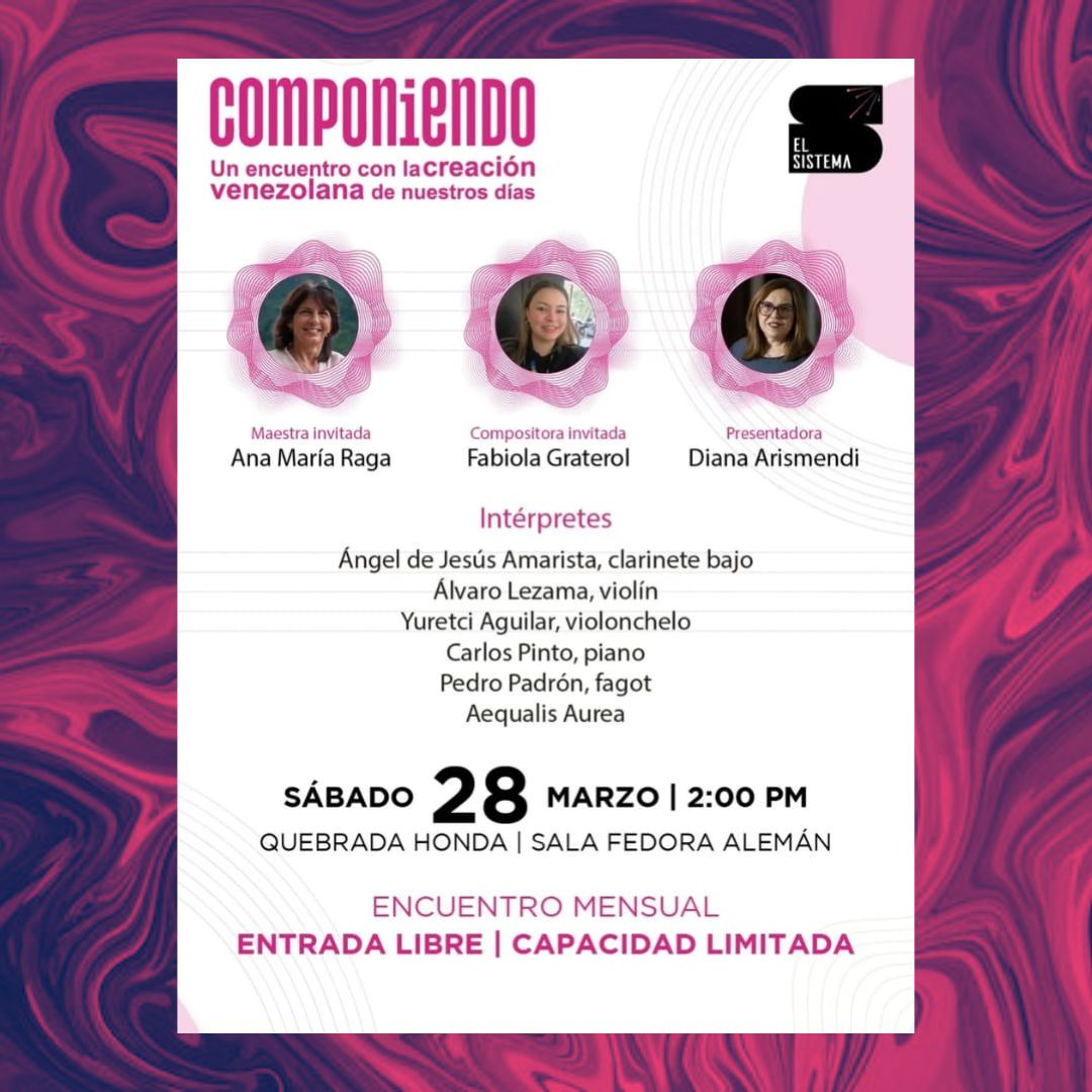 Te invitamos a una nueva edición de «Componiendo», en la sala Fedora Alemán, Quebrada Honda. Este es un encuentro íntimo para descubrir las obras que definen la música de cámara actual en nuestro país. Ve a sumergirte en el talento de las compositoras Fabiola Graterol y Ana María Raga, bajo la interpretación de la agrupación Aequalis Aurea y músicos destacados.
