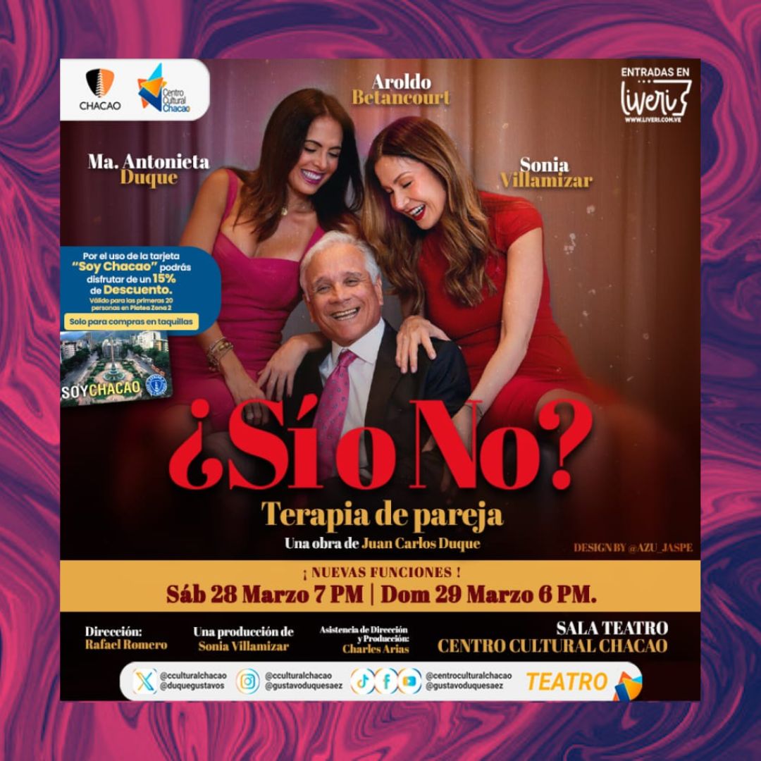 Aroldo Betancourt, Sonia Villamizar y María Antonieta Duque se apoderan de las tablas del Centro Cultural Chacao en: “¿SÍ O NO?”. Una pieza que disecciona la convivencia con humor y una pizca de picardía. Cuando la rutina toca a la puerta, Marielena decide invocar a una psicoterapeuta moderna que pondrá el mundo de Jesús Ernesto de cabeza. Una comedia inteligente sobre las crisis que no vemos venir y las verdades que preferimos callar.