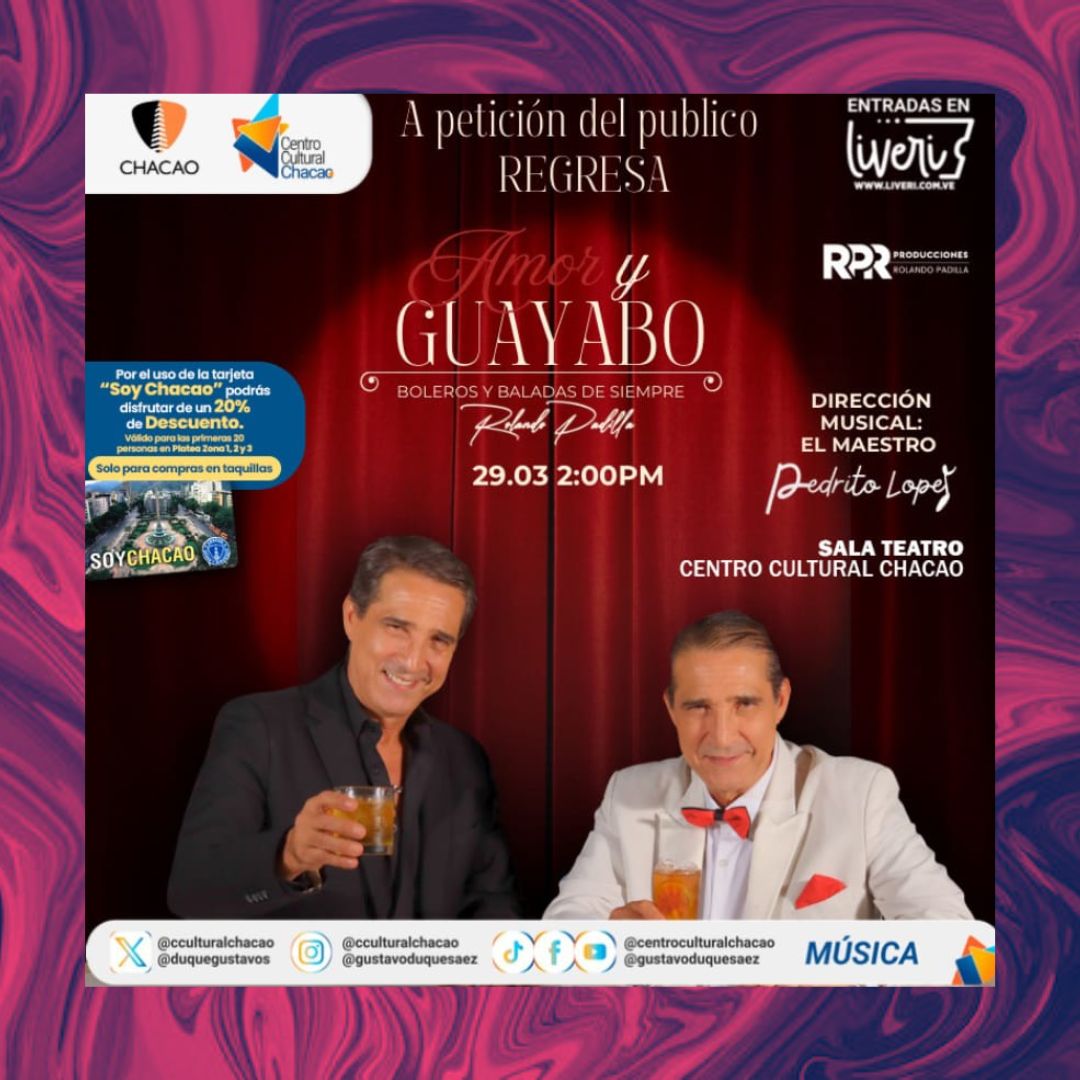El Centro Cultural Chacao se llena de nostalgia y alegría con “Amor y Guayabo”. El primer actor y cantante Rolando Padilla nos regala un espectáculo íntimo donde las risas, las anécdotas y los mejores boleros de los 60 y 70 serán los protagonistas.