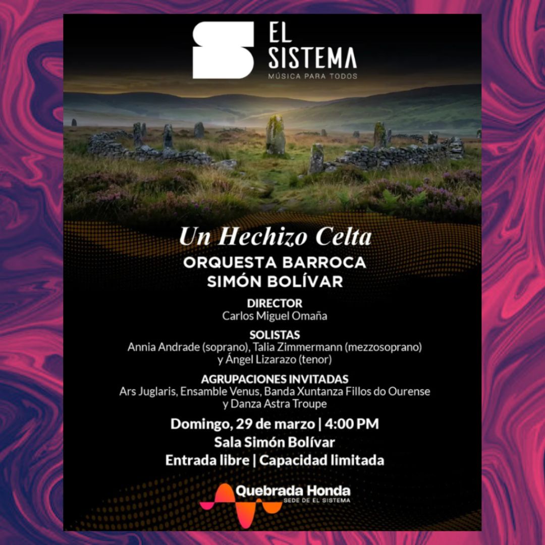 «Un Hechizo Celta» es un encuentro donde la versatilidad de la Orquesta Barroca Simón Bolívar se une al encanto de las leyendas antiguas. Bajo la dirección de Carlos Miguel Omaña, vivirás un viaje inolvidable a través de la música, el canto y la danza.