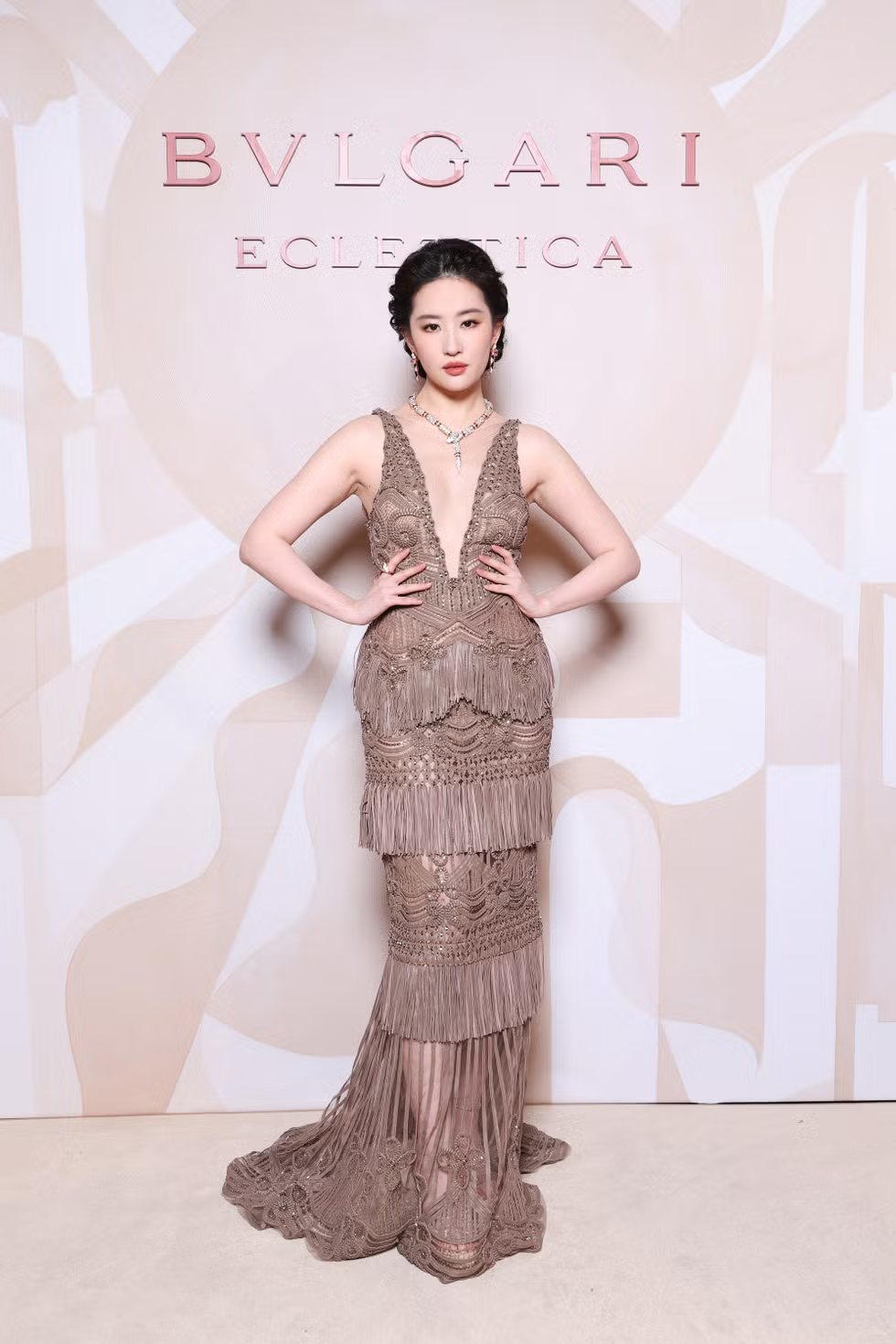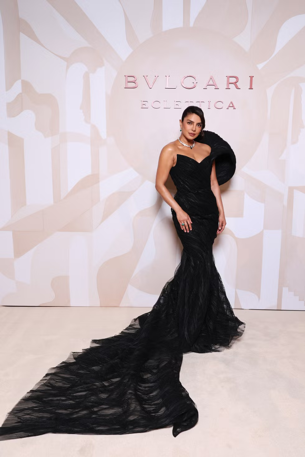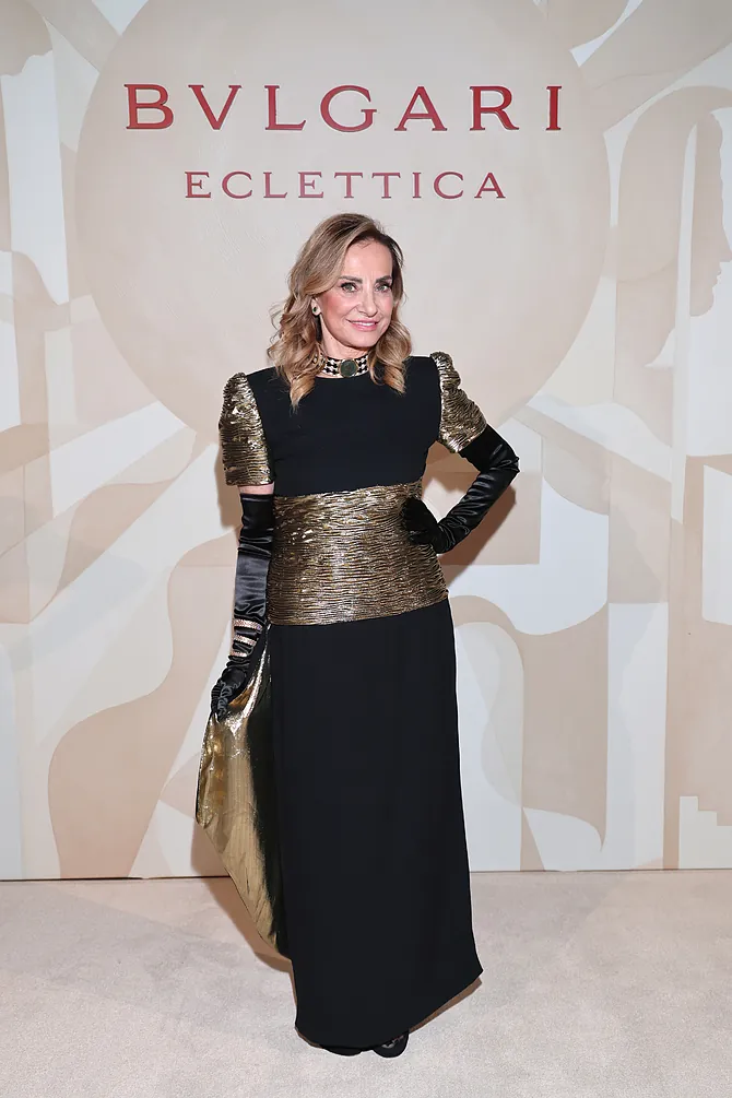 La directora creativa de Bvlgari escogió un diseño en tejidos combinados y joyas de la firma de lujo.