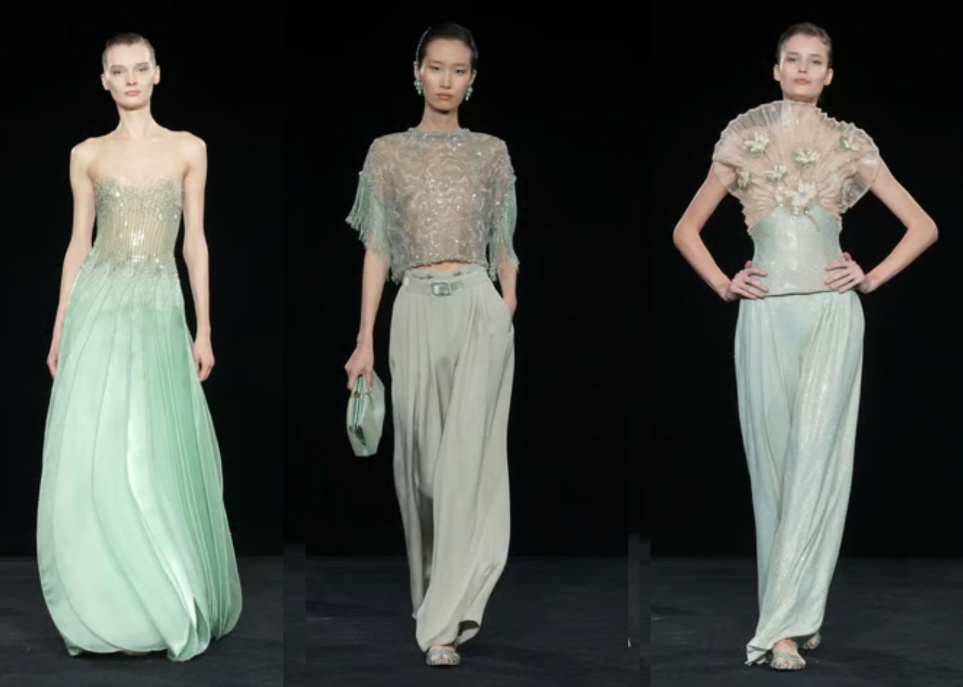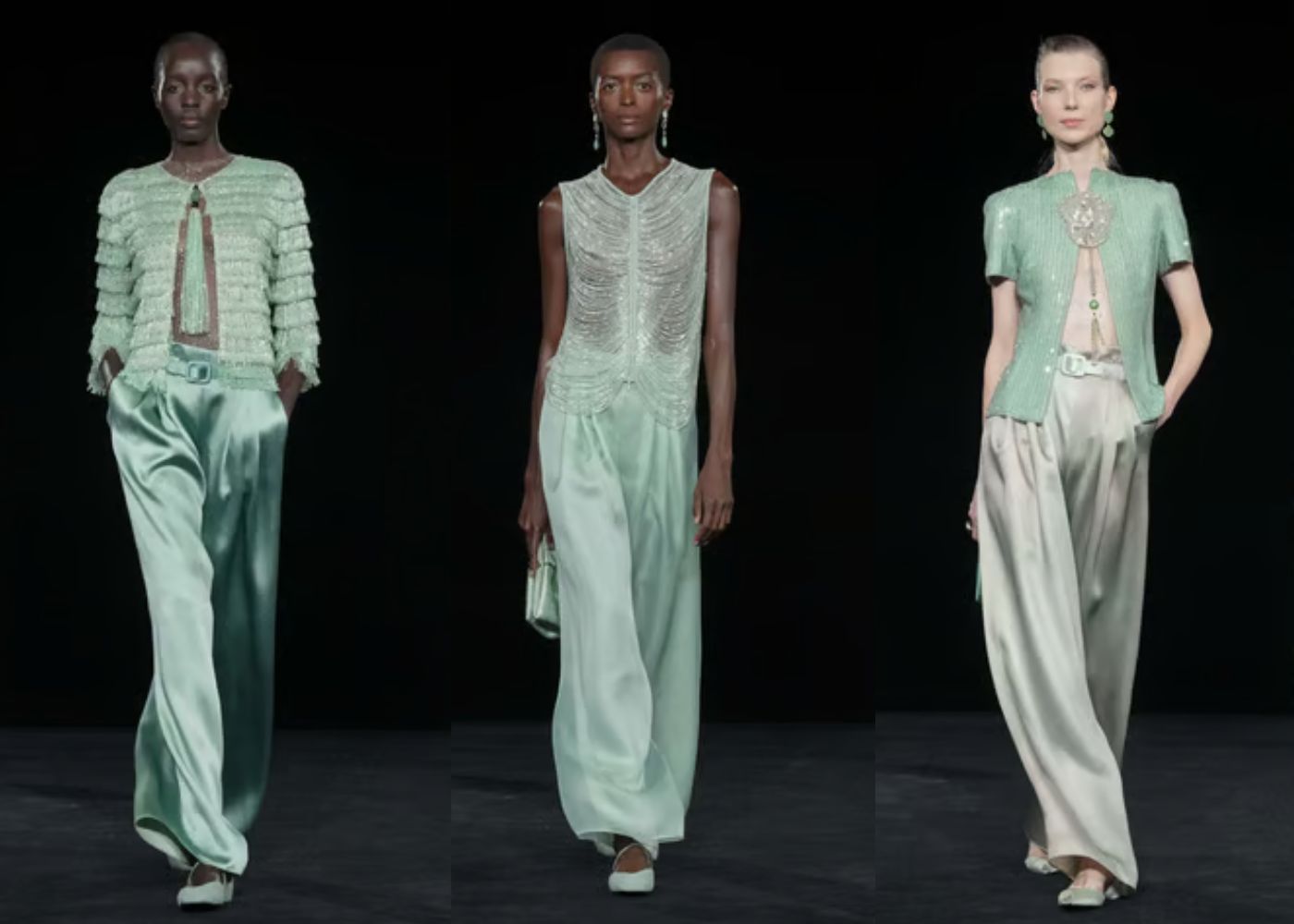 La paleta cromática gira en torno al verde jade, símbolo de sabiduría, paz y crecimiento, explorando unas 40 tonalidades que van desde el lima vibrante hasta el musgo sutil, el menta fresco y la espuma marina. Este color impregna vestidos fluidos, blazers oversize y tejidos satinados, creando un efecto luminoso y sereno que transforma la silueta femenina en un oasis de glamour discreto.