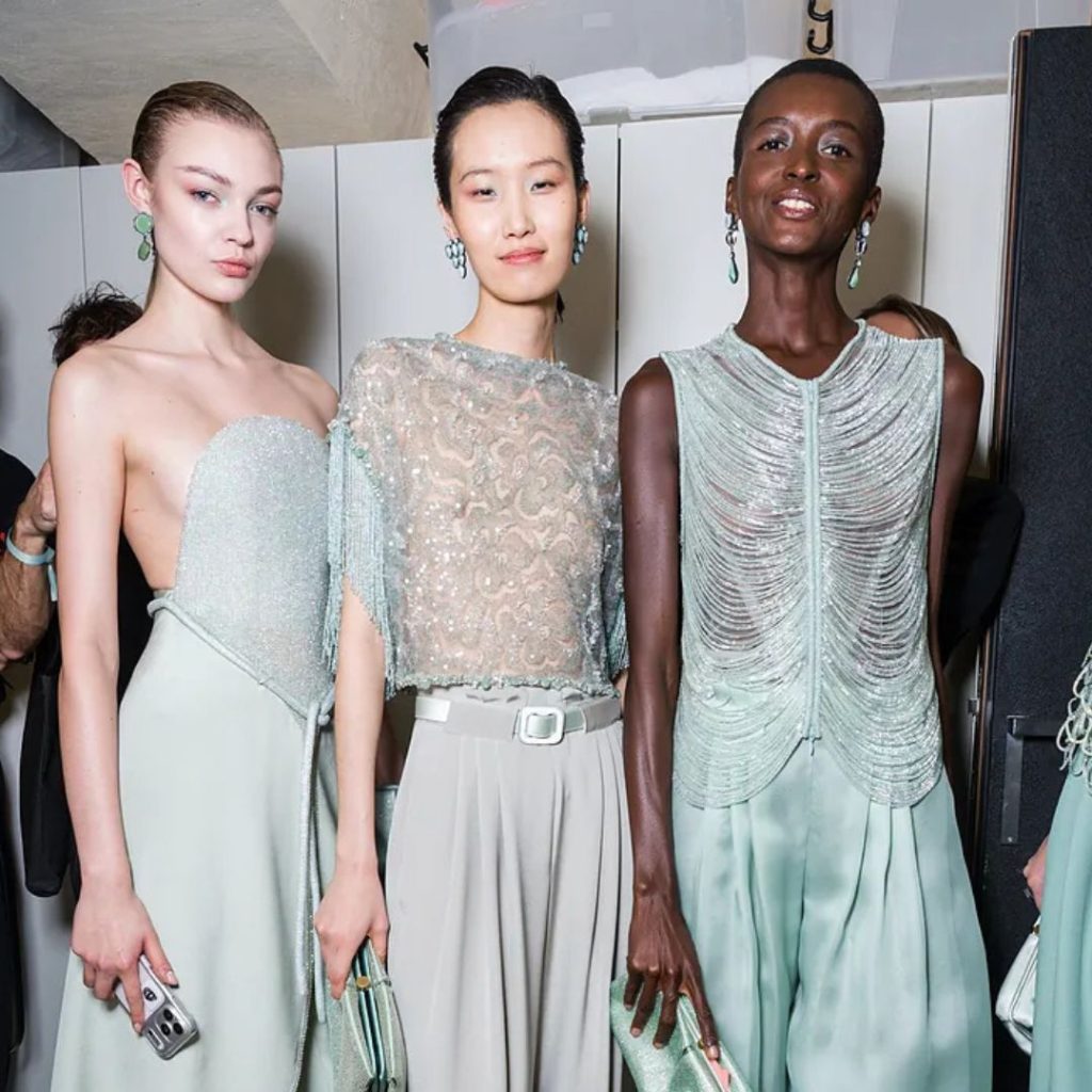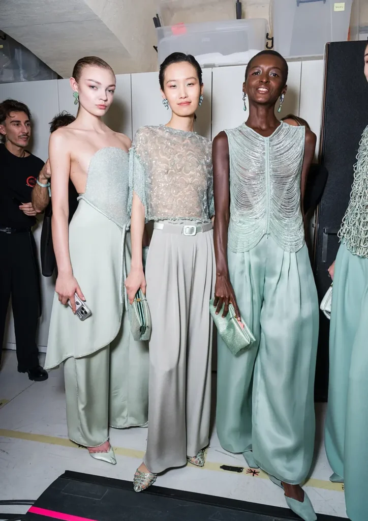 La paleta cromática gira en torno al verde jade, símbolo de sabiduría, paz y crecimiento, explorando unas 40 tonalidades que van desde el lima vibrante hasta el musgo sutil, el menta fresco y la espuma marina. Este color impregna vestidos fluidos, blazers oversize y tejidos satinados, creando un efecto luminoso y sereno que transforma la silueta femenina en un oasis de glamour discreto.