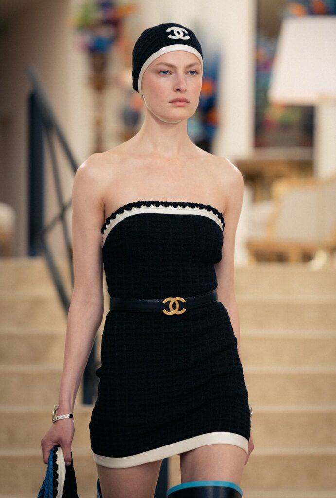 Las rayas marineras aparecen como un guiño al paisaje de la urbe. El vestido negro corto, eterno emblema de Chanel, se reinventa desde el movimiento, perdiendo peso visual para ganar actitud.