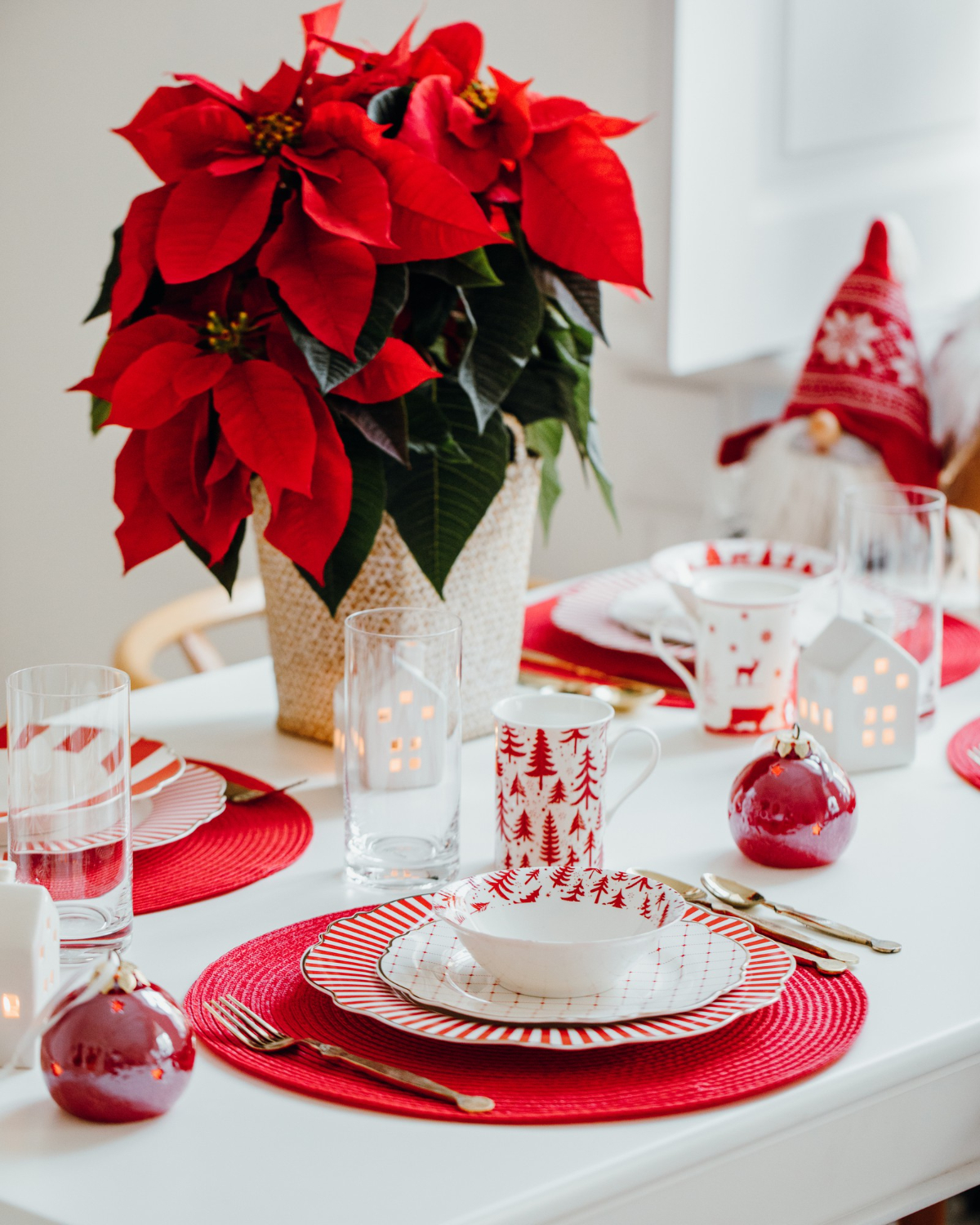 En la configuración de la mesa para las cenas de gala, se impone la mantelería de lino o seda en tonos neutros y la porcelana clásica, preferiblemente con ribetes dorados o platinados. Estos elementos se complementan con centros de mesa que exuden sobriedad, compuestos únicamente por ramas de abeto natural, berries discretas, velas largas de cera pura y, quizás, una sutil Flor de Pascua en su variedad blanca.