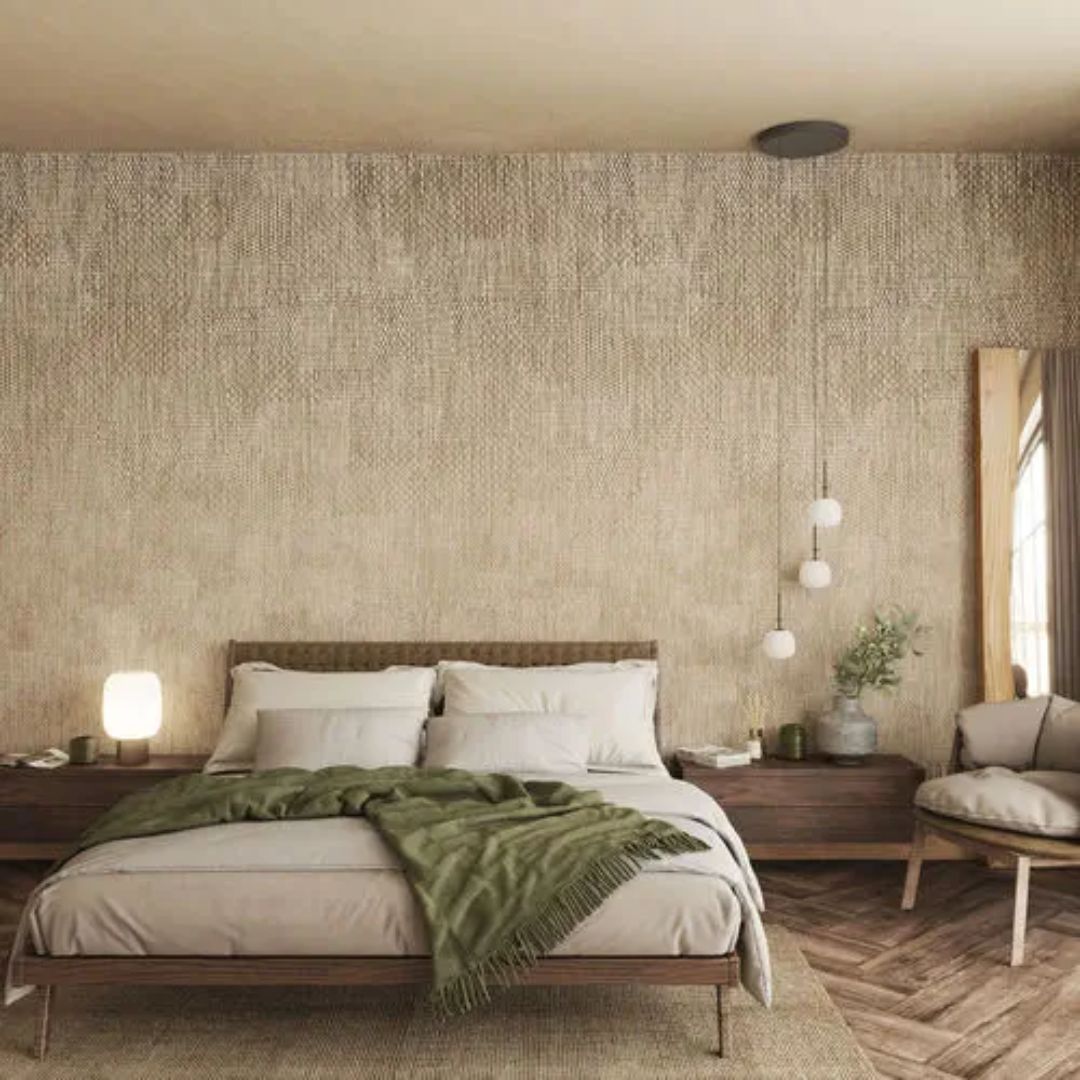 Una opción que no ha dejado de usarse, pero que se ha modernizado es el papel tapiz. Podemos empapelar alguna sección de la sala o la cocina con este efecto saco que le dará un toque sutil al ambiente y que se complementa con todo lo que hayamos adelantado.