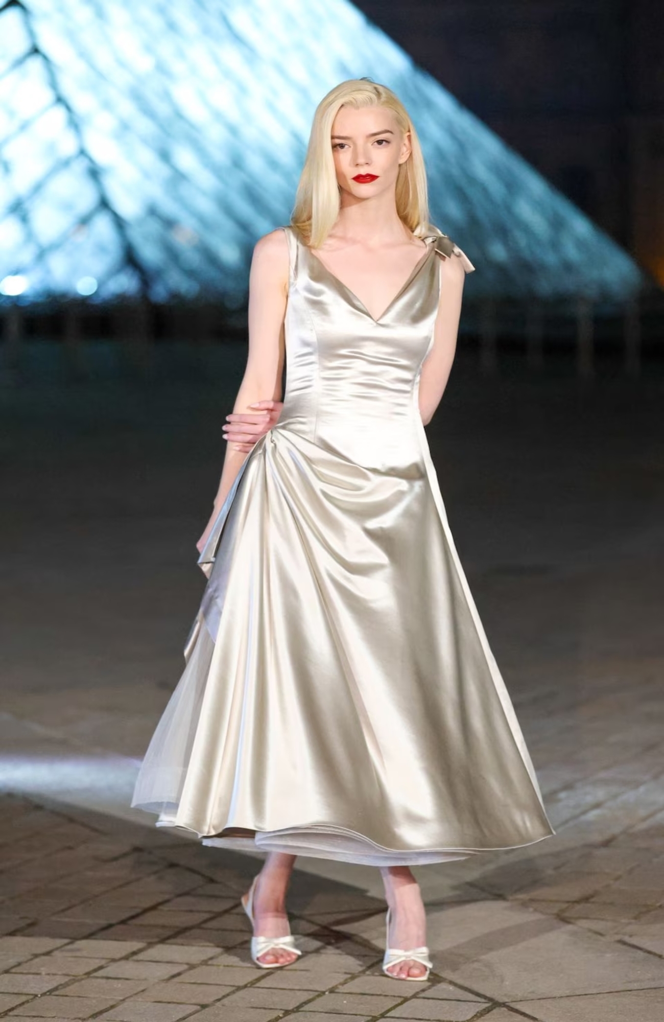La protagonista de Gambito de dama optó por un diseño firmado por, Dior, a cuyo desfile acudió horas antes de la cena. Se trata de un vestido satinado en color blanco de estilo años 50, que presenta falda acampanada con un delicado escote posterior en ‘V’.