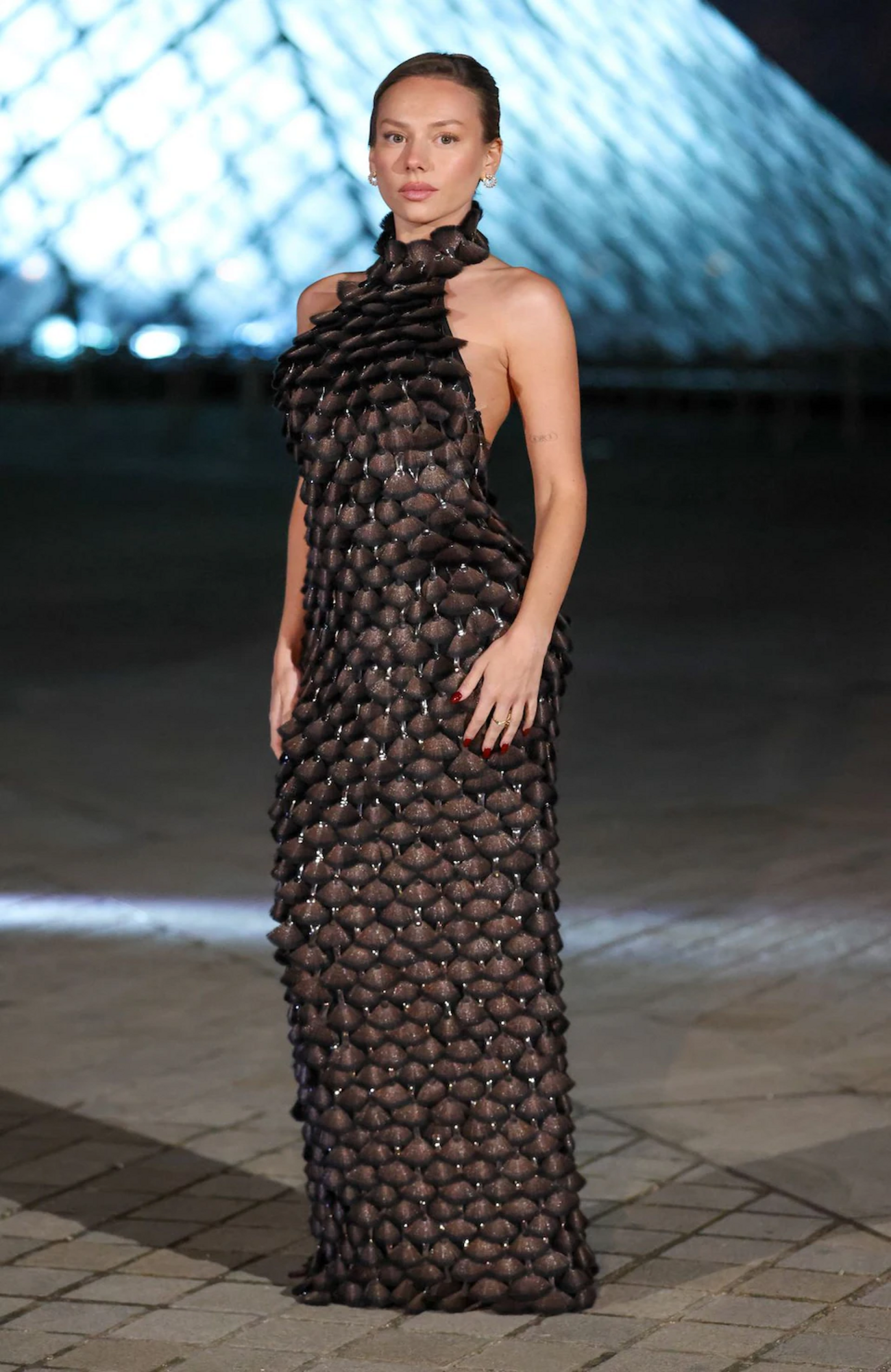 Fue otra de las celebridade que ha cautivado con su look formado por un vestido largo de escote halter con textura de escamas elaborada utilizando brochas de pelo.