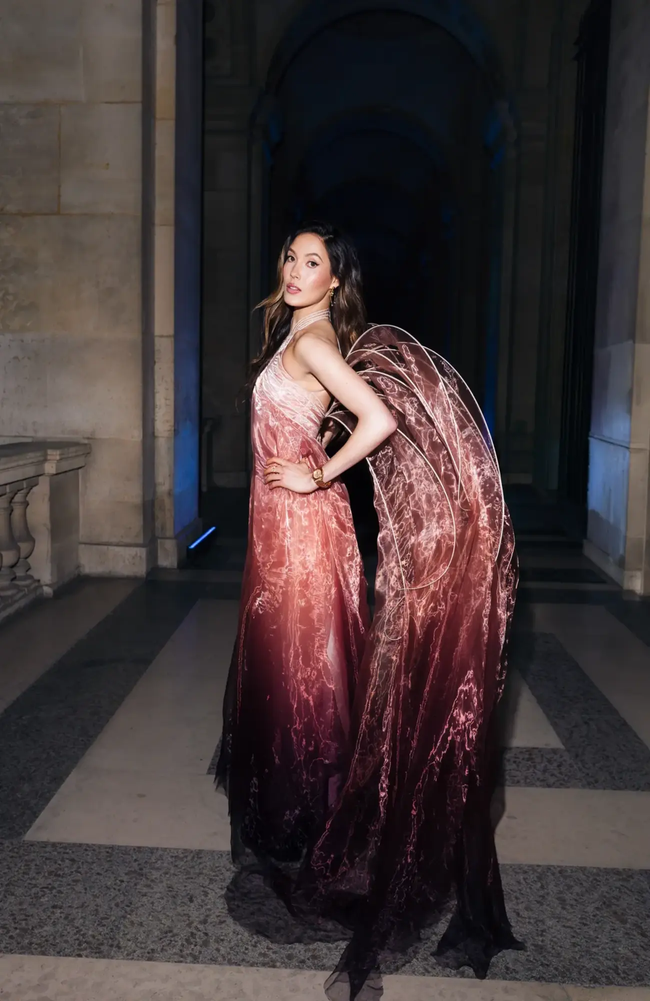 Se decantó por un vestido en tonos rosa con transparencias.