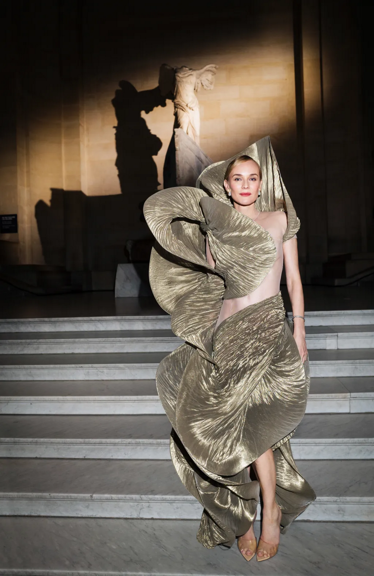Con un atuendo en dorado firmado por Iris Van Herpen Alta Costura Otoño 2023.
