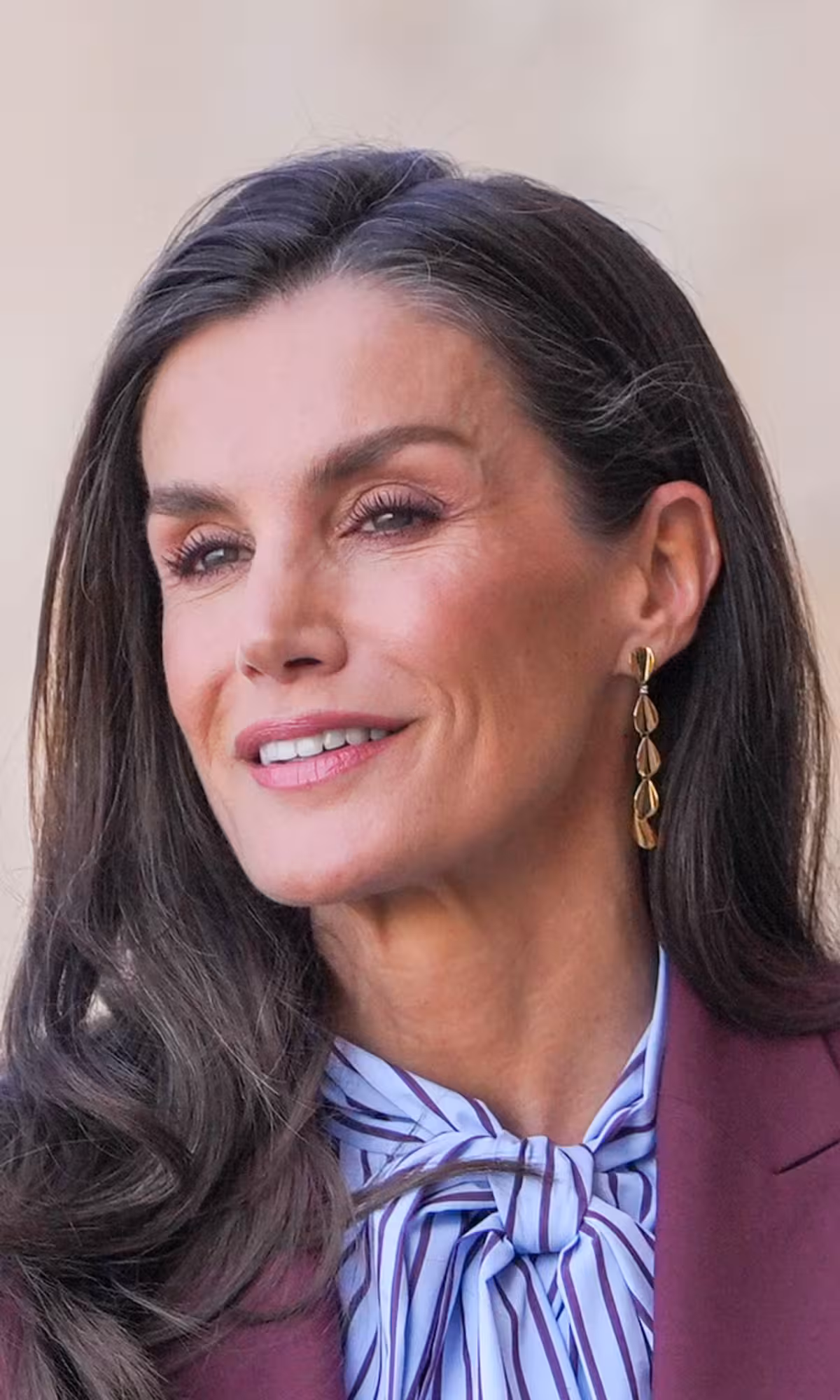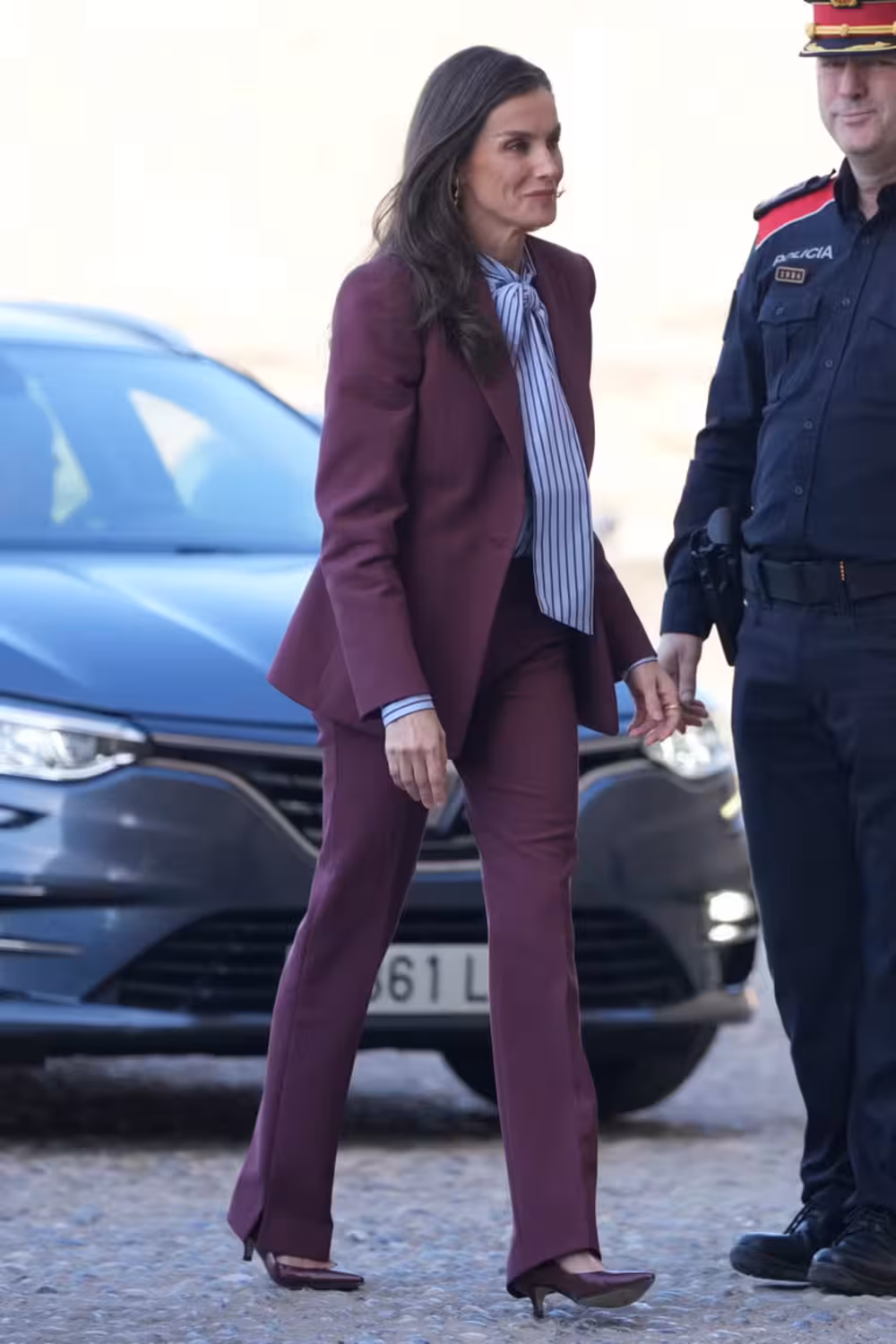 En esta oportunidad, la monarca española complementó su atuendo con una de las tendencias más irresistibles de esta primavera: las blusas con lazada con un print de rayas berenjena verticales. Esta pieza cerrada con un lazo XL pone de manifiesto que la reina está al tanto de todas las novedades de las modas.