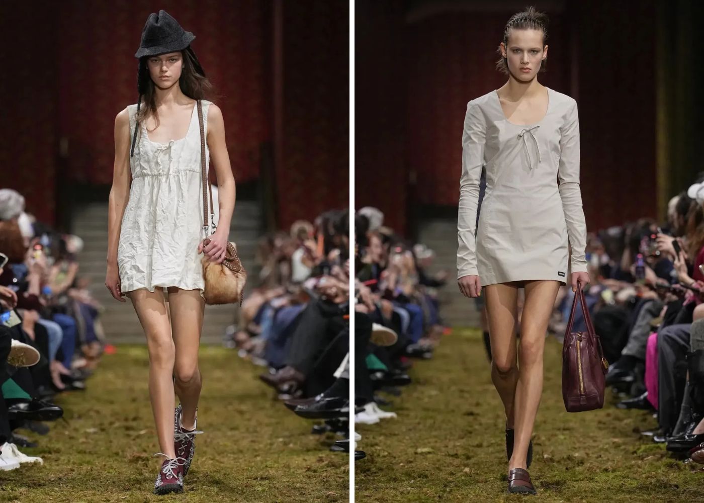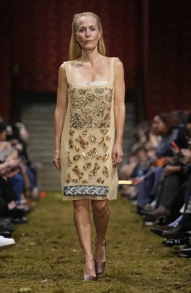 La directora creativa de la maison Miuccia Prada transformó la pasarela en un bosque urbano, donde la moda se siente, se toca y celebra la imperfección durante la presentación de su nueva colección en París que evoca el minimalismo sensible, inspiración en la naturaleza y la celebración de la imperfección.
