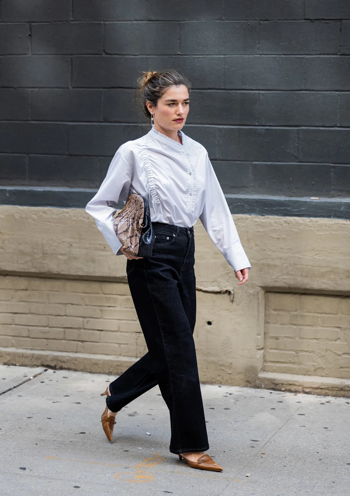 A veces, todo lo que se necesita son elementos básicos bien proporcionados y accesorios resistentes. Una blusa blanca impecable metida en un pantalón es una combinación simple que nunca fallará.