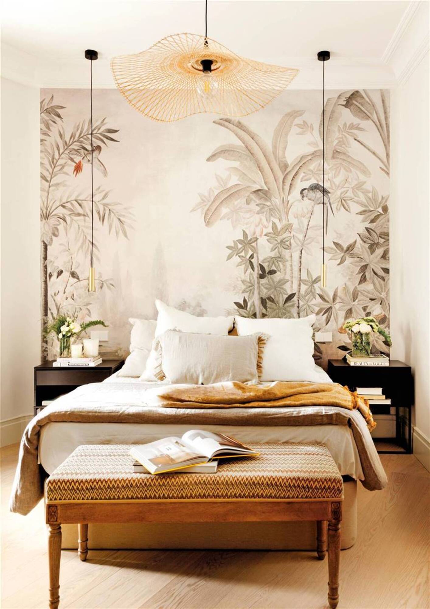 En el dormitorio, elige una pared focal como la del cabecero de la cama para un efecto relajante con patrones suaves o texturas cálidas para un efecto relajante con patrones suaves o texturas cálidas.