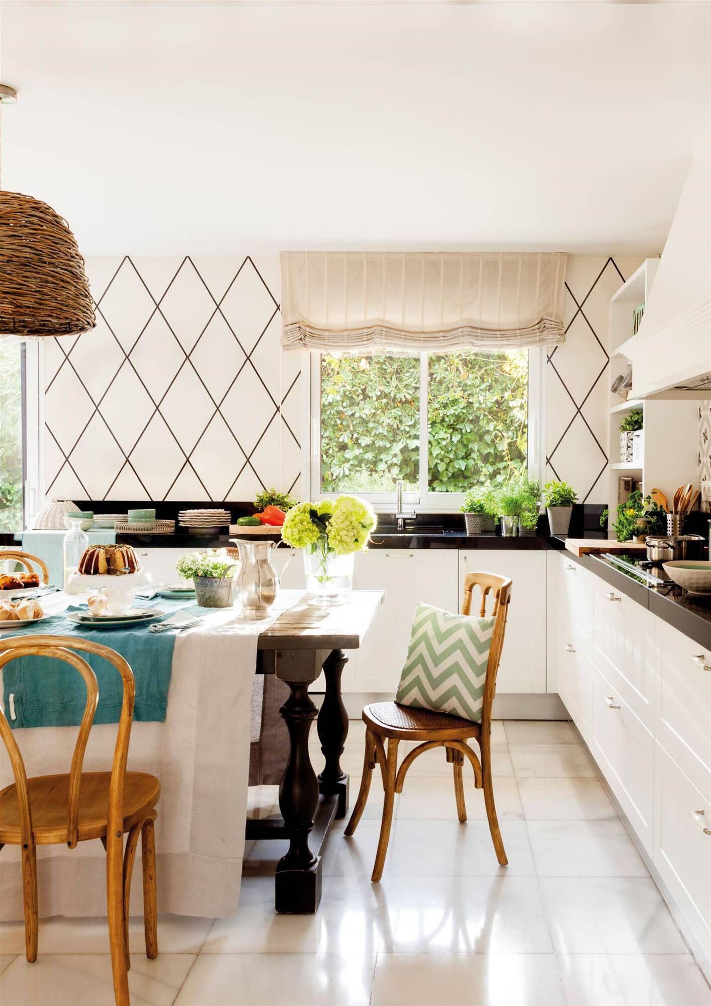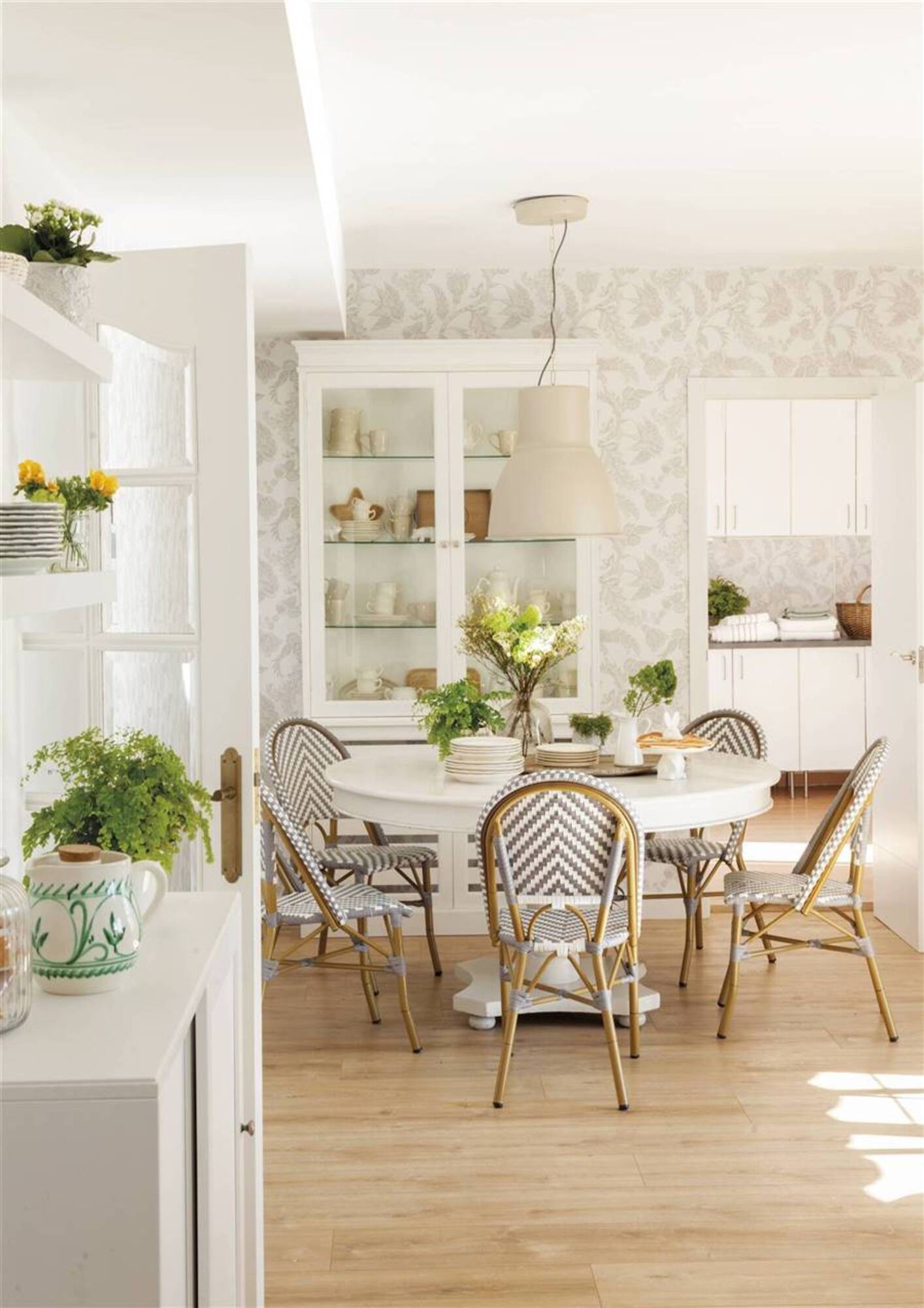 En el caso del comedor elige papel vinílico lavable aplícalo en fondos de estanterías, interiores de alacenas o frentes de cajones para sumar detalle sin recargar las paredes principales.
