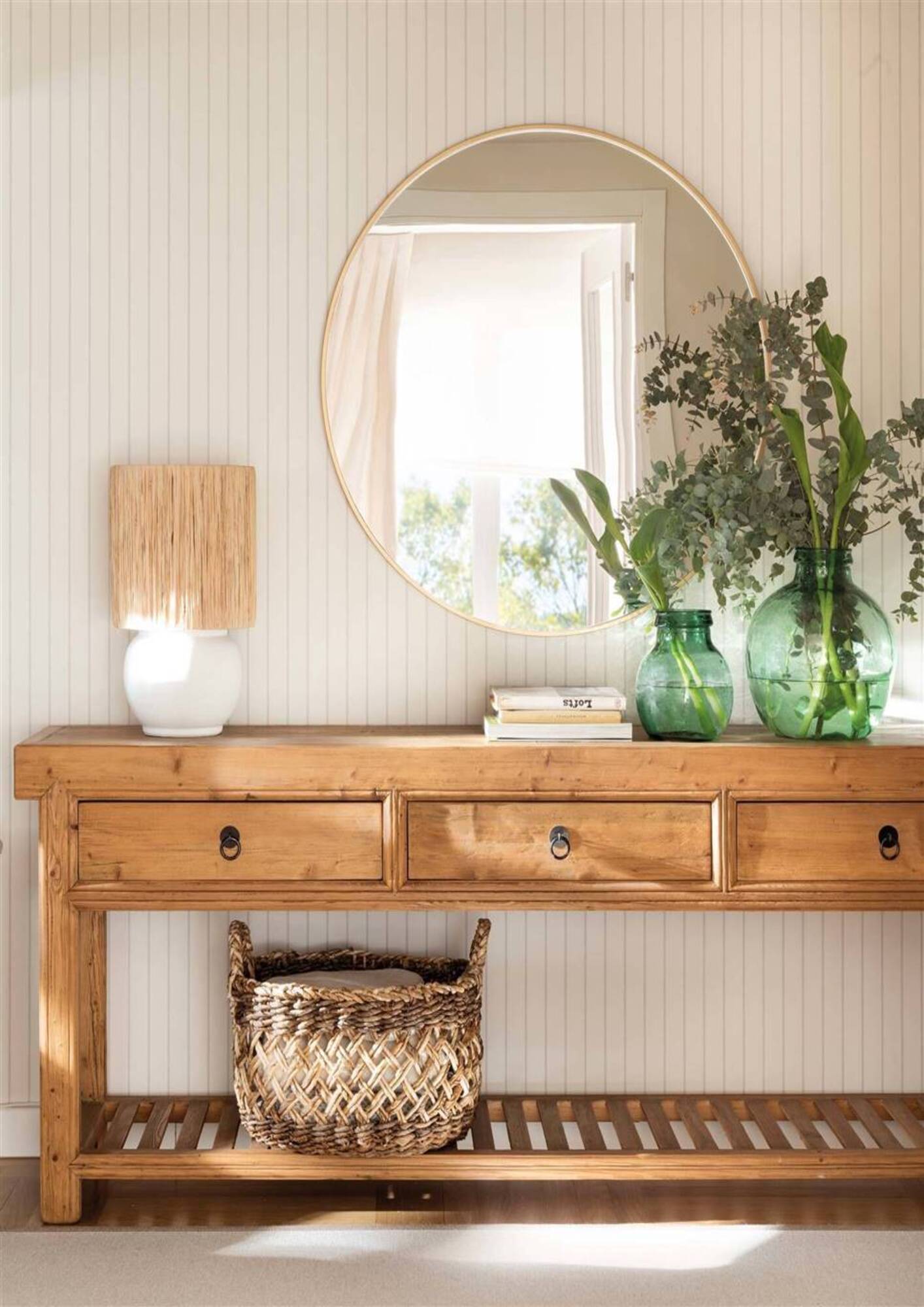 En los pasillos y recibidores se benefician de diseños ligeros y luminosos que den la bienvenida: combina un papel tapiz sutil con una mesa y agrega detalles como plantas y un espejo.