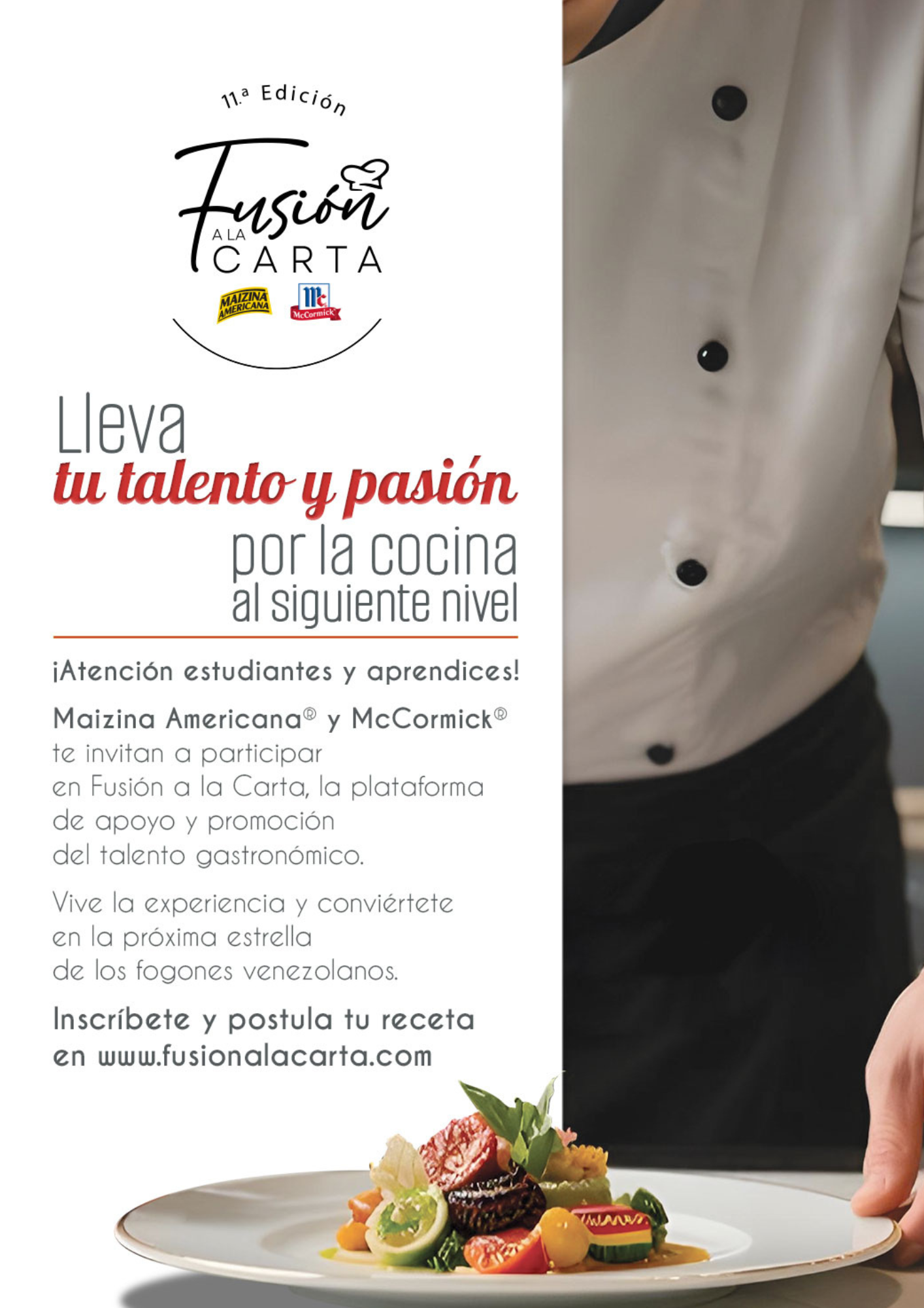 Fusión a la Carta celebra su undécima edición consolidada como la plataforma de apoyo, promoción y proyección para el talento gastronómico venezolano. En estrecha relación con las escuelas de gastronomía y con un jurado conformado por expertos destacados del mundo gastronómico local, Fusión a la Carta busca continuar siendo fuente de oportunidades para el futuro profesional de estudiantes y aprendices de cocina. Los estudiantes y aprendices de cocina pueden inscribirse hasta el 24 de octubre en www.fusionalacarta.com, postulando recetas creativas que incluyan, al menos, un producto de Maizina Americana® y uno de Sazonadores McCormick®.