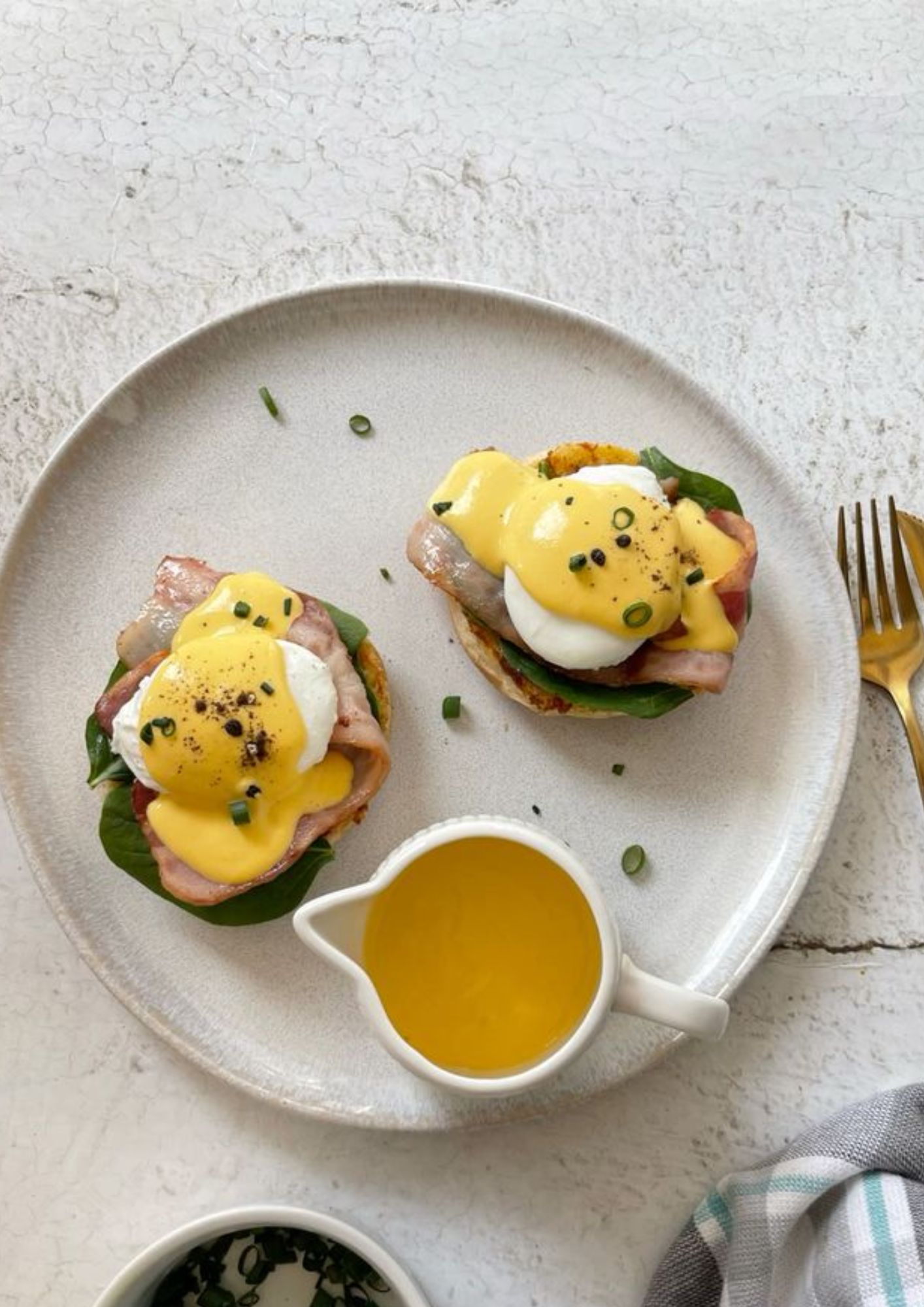 Enmantequillar cada rebanada de muffin o pan redondo. Colocarle encima la rebanada de jamón o salmón. Colocar cada huevo en una sartén con agua y una cucharadita de vinagre blanco. Calentar sin que hierva y cocinar el huevo hasta que endurezca la clara (huevo poché). Colocar el huevo sobre el muffin . Bañar ambos con la salsa holandesa. Adornar con tomates cherry y ramitas de ciboulette.